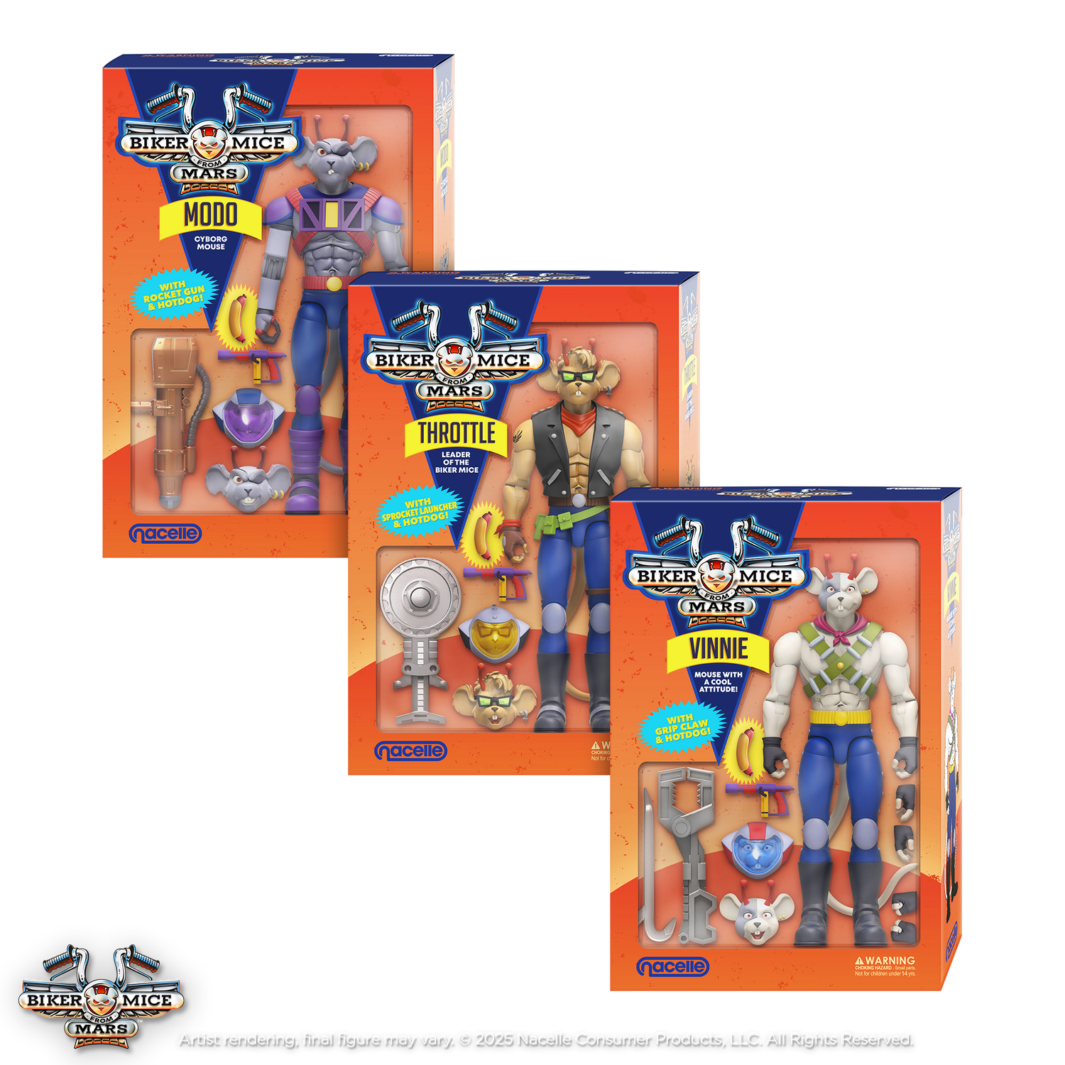Get ready for the first wave of Biker Mice From Mars action figures featuring Vinnie, Modo, and Throttle! Each figure is packaged with unique accessories and equipped with 22 points of articulation - allowing for dynamic posing and action-packed play.