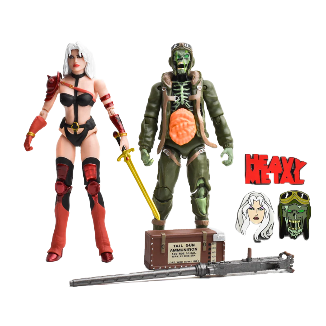 Taarna features all new shoulder armor as well as a brand new sword of power! Nelson has an all new paint scheme to match the coloring of the variant cover. This twin pack will also have three Lapel pins with Heavy Metal's Iconic Logo, as well as Taarna and Nelson Comic Heads.