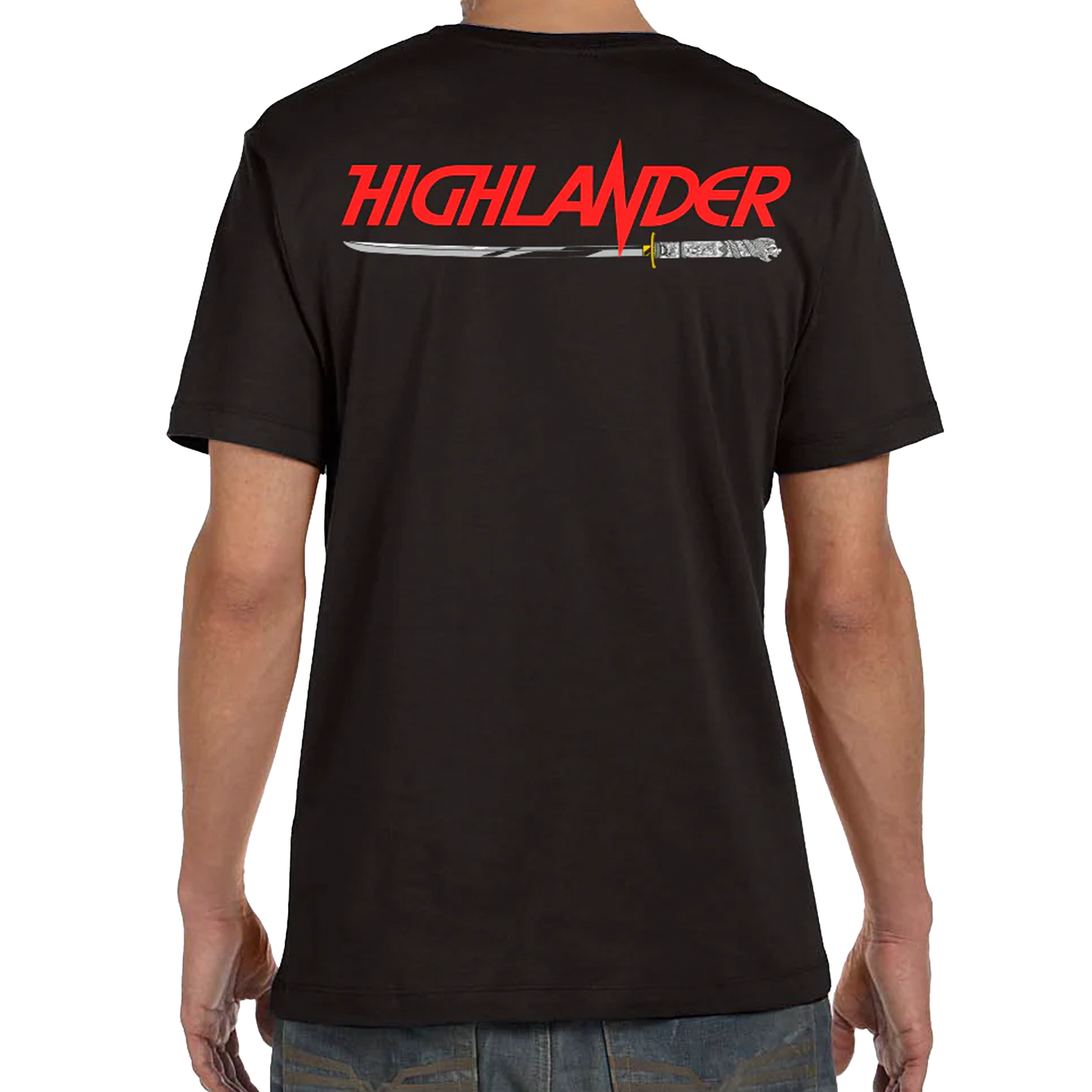 Be immortalized in this officially licensed Highlander T-shirt featuring Lightning print front, and Katana design on the back.