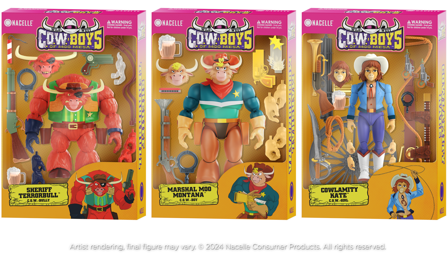 Strap up your stirrups and throw on your C.O.W.-Boy hats, cause it’s time to take the trail back to Cow Town with wave 1 of the Wild West C.O.W.-Boys of Moo Mesa! Take home Marshal Moo Montana, Cowlamity Kate, and Terrorbull with this all-in-one bundle! Each figure comes individually packaged, chock-full of unique accessories, and are fully articulated to allow for quite the MOOvelous time.