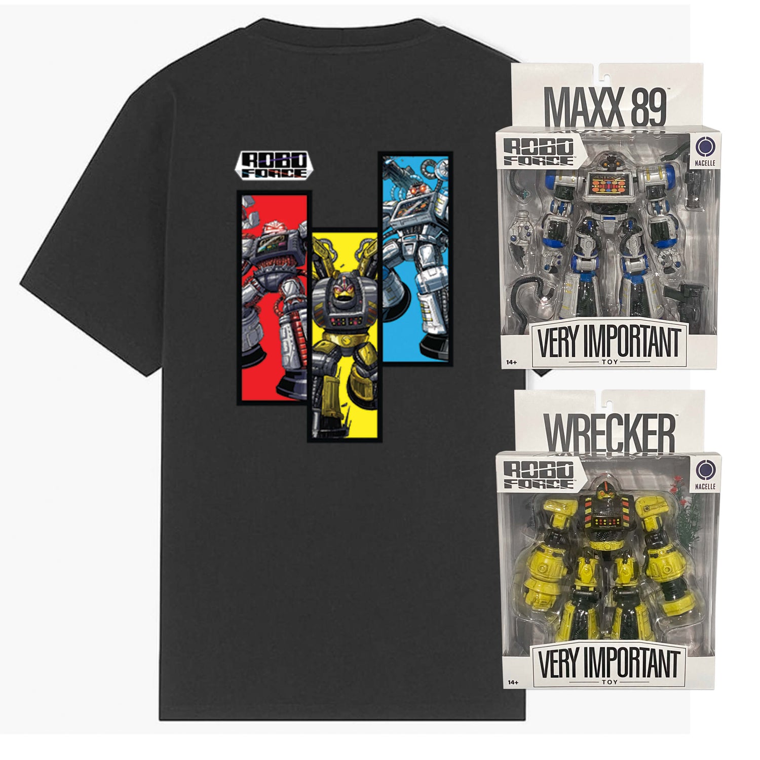 The VERY Important Bundle is here to make all your RoboForce dreams come true. Both Wave 1 figures and a modern concept art tee are included in this exclusive bundle.