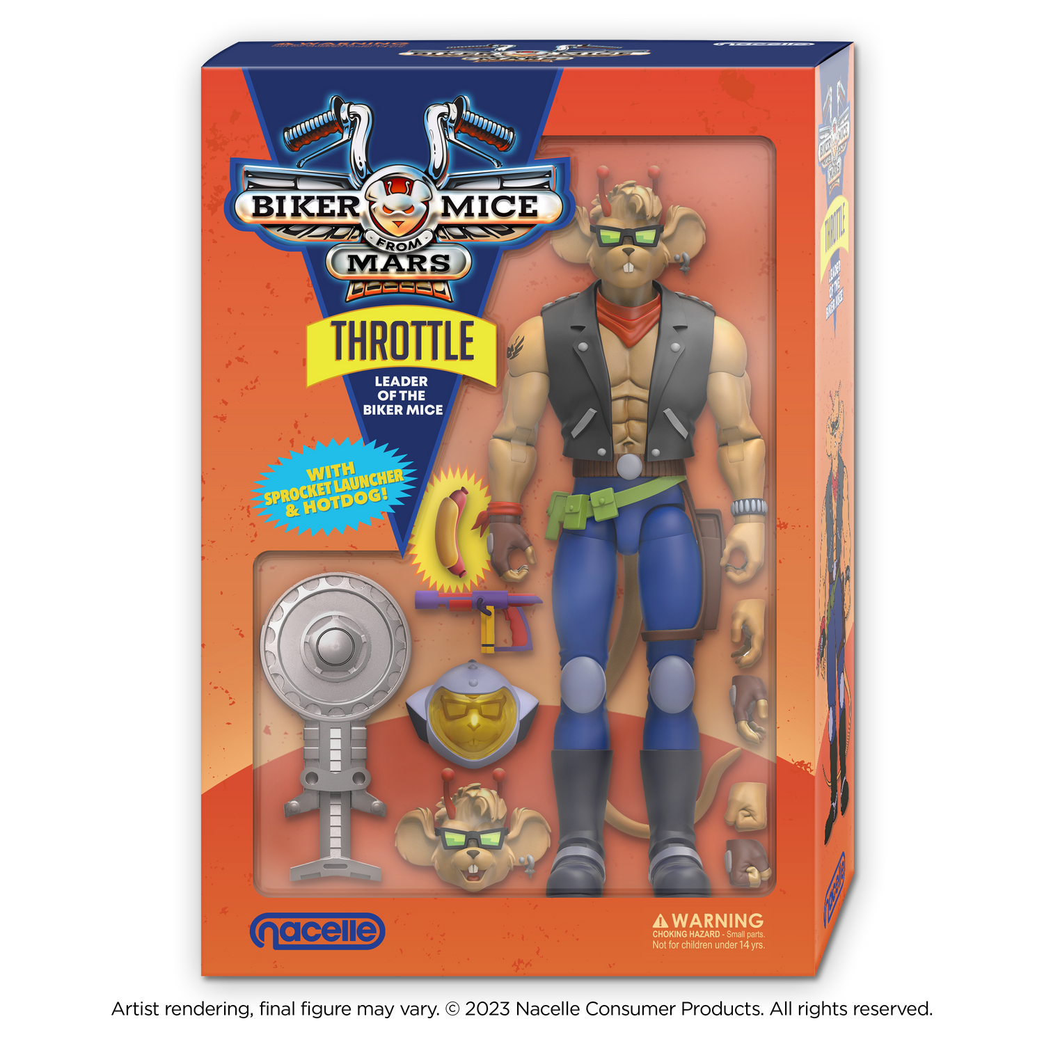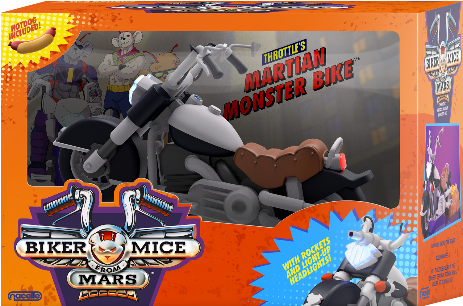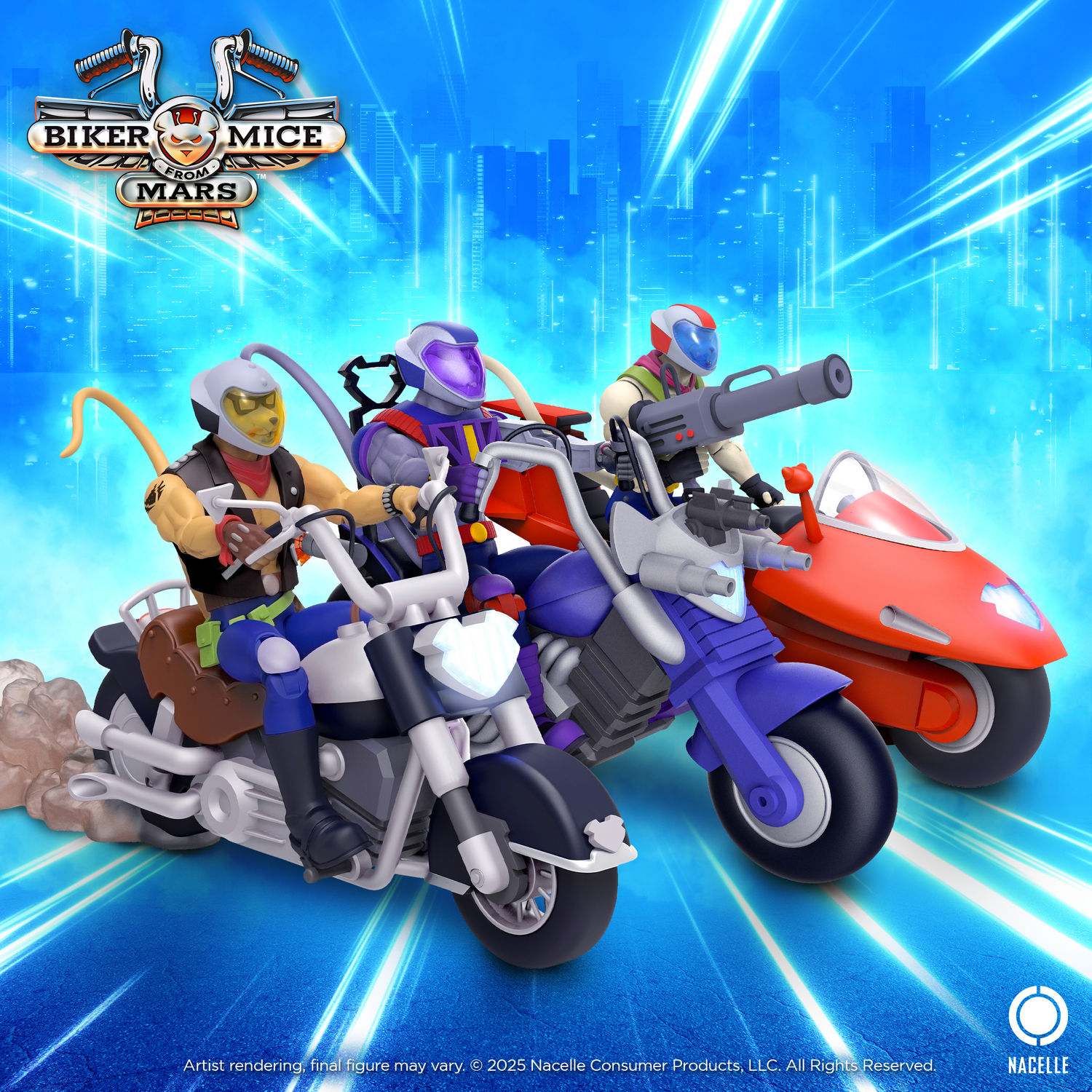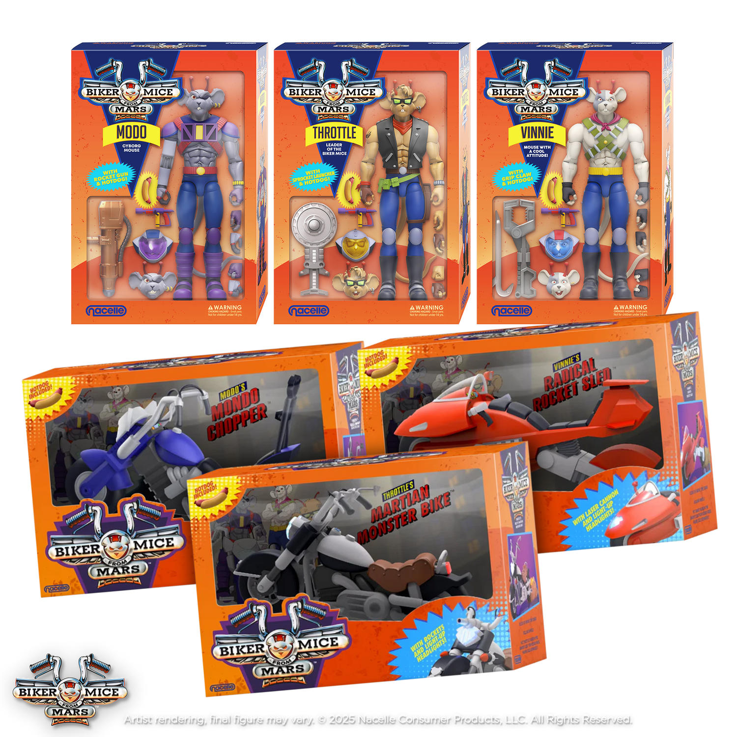 Completa tu colección Biker Mice de Mars con el Pack Definitivo de Moto + Ratones. Incluye a Modo, Throttle, Vinnie y sus tres motos. ¡No hay mejor manera de demostrar tu pasión por los Biker Mice que tenerlos listos para la acción!