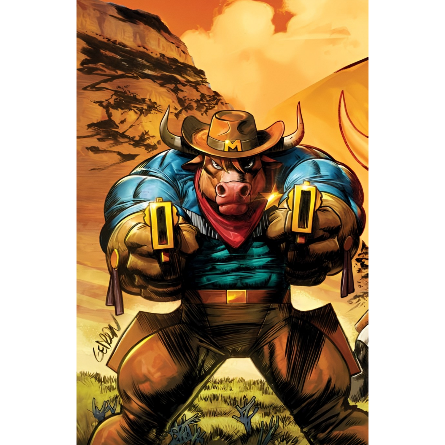 Basados en la clásica serie animada y su exitosa línea de juguetes coleccionables, los VAQUEROS de Moo Mesa están de VUELTA y listos para un nuevo enfrentamiento en la frontera, ¡de la mano del escritor Matt Hotson (Power Rangers: The Return) y el artista Juan Gedeon (DC: The Jurassic League)! Antes de que se haga con la insignia, ¡adéntrate en el pueblo fronterizo sin ley de Moo Mesa para conocer al Mariscal Moo Montana en su primera aventura! En una época dominada por el miedo y la incertidumbre, el desorden invade el desierto y sus ciudadanos han comenzado a desaparecer, incluyendo a la antigua mentora de Moo, la respetada Sheriff Mary Quine. Con sombras que se ciernen sobre la mesa, Moo debe lidiar con viejos rencores, nuevas alianzas y una conspiración que se adentra en lo más profundo del pasado de la mesa. Combinando el encanto nostálgico de la querida serie de los sábados por la mañana con una nueva visión audaz, sigue a Moo Montana, Dakota Dude, Cowlamity Kate y más en una saga de justicia, misterio y redención en un mundo donde el honor lleva sombrero y cabalga sobre un corcel. Esta es Moo Mesa como nunca la has visto: más profunda y audaz. ¡Prepárate!