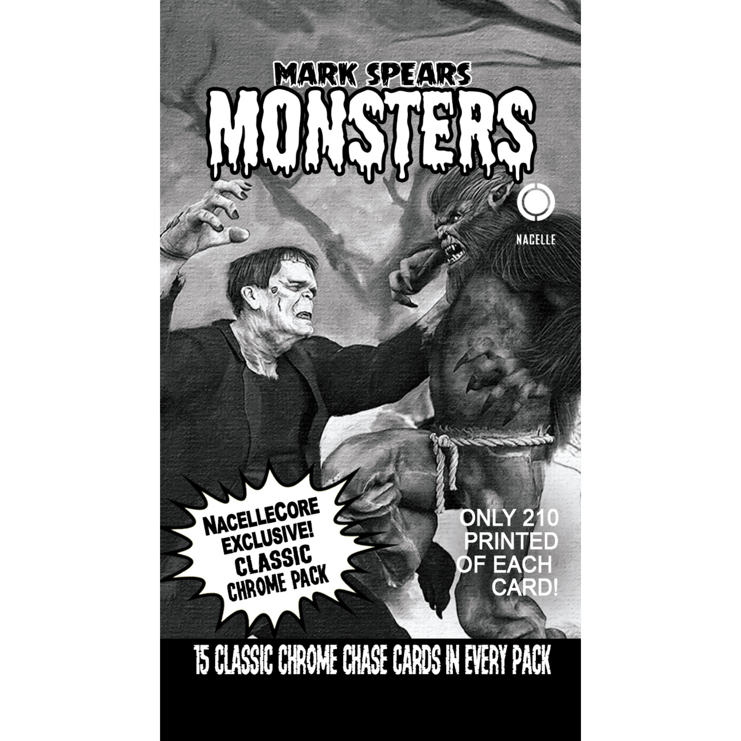 ¡La serie de cartas coleccionables más esperada de 2021! Las cartas coleccionables de monstruos de Mark Spears cuentan con ilustraciones originales de Mark Spears, Artista del Año de Rondo Horror. Disponibles exclusivamente a través de Nacelle, Mark Spears te trae una colección de 15 cartas de persecución clásicas de Chrome, ¡disponibles en un paquete terrorífico!
