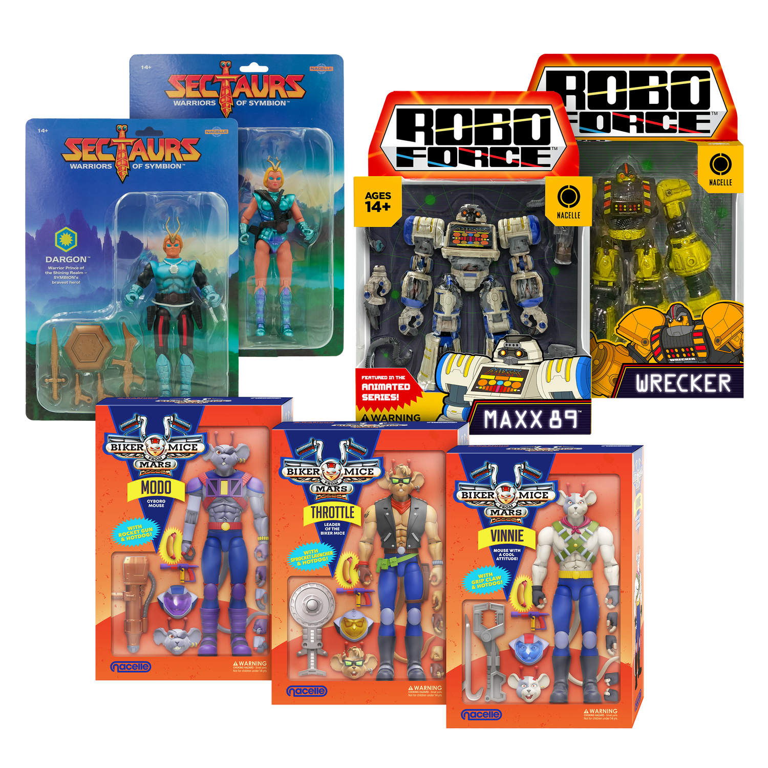 Discover the beginning of the NacelleVerse with this massive Wave 1 multi-franchise bundle featuring the first action-figure releases from Biker Mice From Mars, RoboForce, and Sectaurs—all packed with premium articulation, collector-focused packaging, and iconic accessories. Whether you’re expanding your collection, jumping into the NacelleVerse for the first time, or looking for the ultimate gift for a classic toy fan, this bundle delivers unmatched nostalgia and display power.