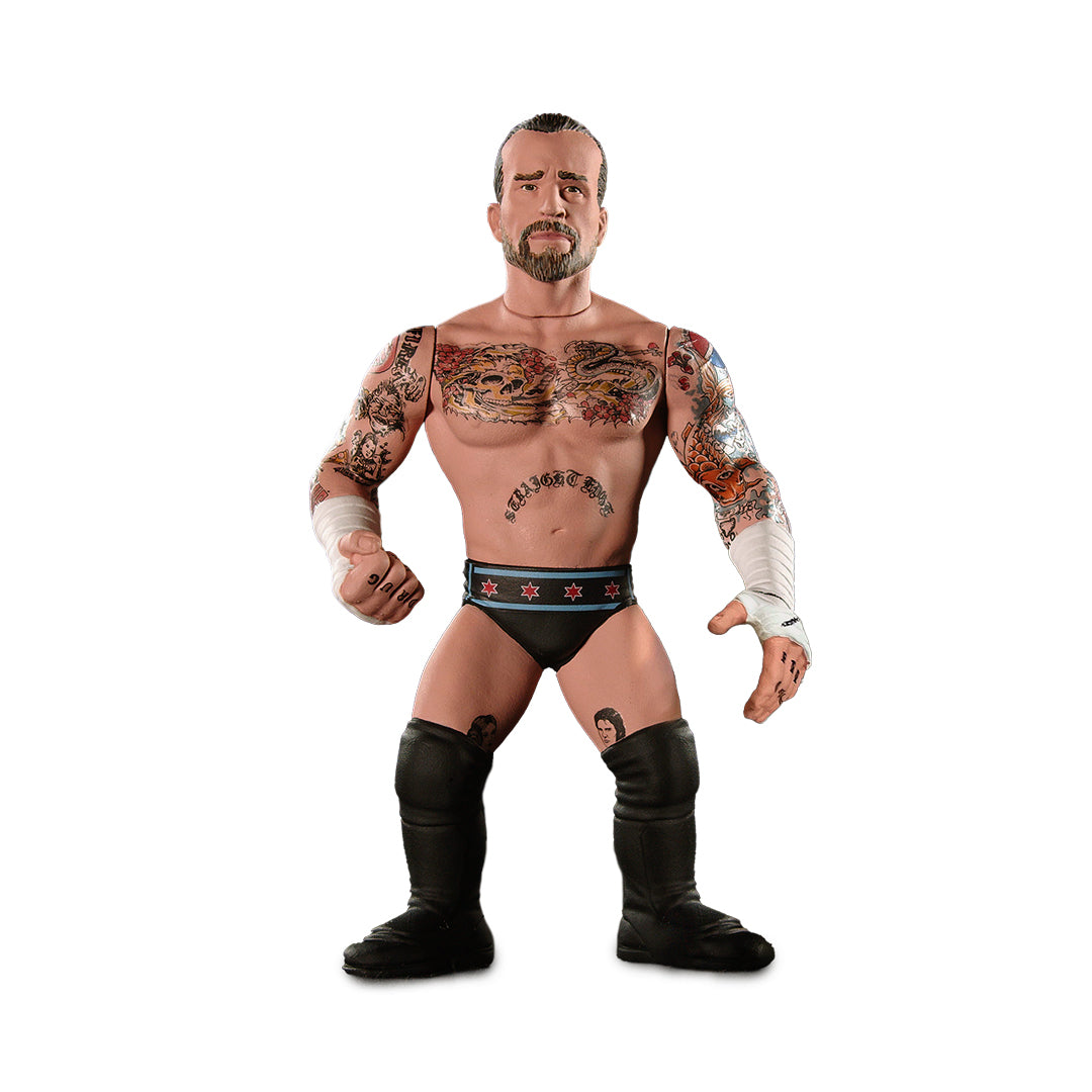 This officially licensed, premium 4.5-inch-scale figure captures the spirit of early 1990s wrestling figures with a stylized, dynamic design and exceptional attention to detail. CM Punk is uniquely sculpted with a realistic character likeness, authentic ring attire, and a classic pose featuring articulation at the neck, shoulders, wrists, and waist—perfect for both display and play.